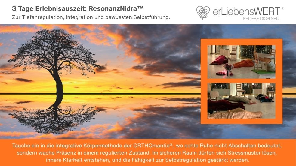ResonanzNidra™ verbindet die Struktur des Yoga Nidra mit Atemarbeit, Klangführung und dem 4-Ebenen-Modell der ORTHOmantie®. Im liegenden Schutzraum der Ruhe wird Dein Nervensystem schrittweise in einen Zustand tiefer Regulation geführt. Atemrhythmus, innere Bilder und Frequenzimpulse unterstützen die Integration zwischen Körper, Emotion, Denken und Bewusstsein. Es entsteht kein Schlaf – sondern bewusste Regeneration.