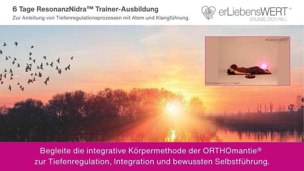 Erlerne die Anleitung zur Tiefenregulation multidimensional umzusetzten. ResonanzNidra™ verbindet die Struktur des Yoga Nidra mit Atemarbeit, Klangführung und dem 4-Ebenen-Modell der ORTHOmantie®. Im liegenden Schutzraum der Ruhe wird Dein Nervensystem schrittweise in einen Zustand tiefer Regulation geführt. Atemrhythmus, innere Bilder und Frequenzimpulse unterstützen die Integration zwischen Körper, Emotion, Denken und Bewusstsein. Es entsteht kein Schlaf – sondern bewusste Regeneration.
